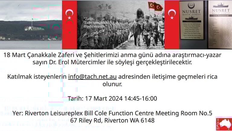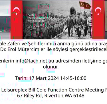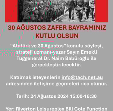 In order to celebrate 30 August Victory Day, we hold an interview with Strategy Expert-author PhD Naim Baburoglu about "Ataturk and 30 August" via online on August 24th, 2024 3:00pm-4:30pm at Riverton Leisureplex Bill Cole Function.